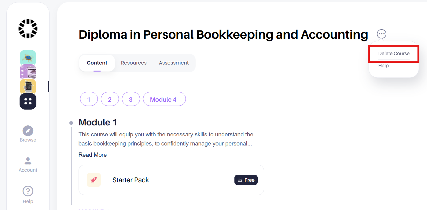 After logging into your account, you can remove the course by clicking the three dots shown next to the course title and choosing 'Delete Course'.