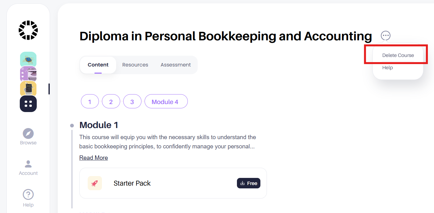 To delete a course, click on the three (...) in front of the course name. Click on delete Course>> Remove this course. The course will be removed from your account.